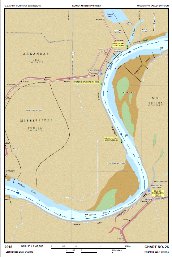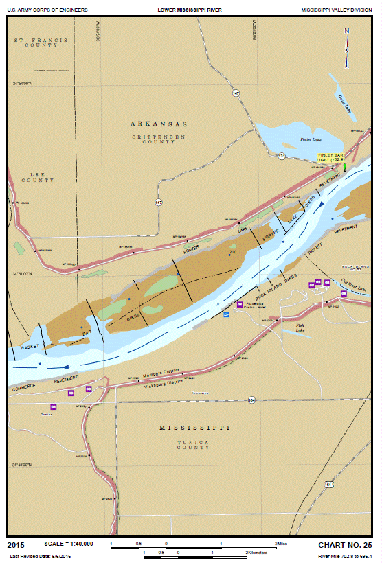 But fortune has many twists and turns along its convoluted route. Today Commerce has been rejuvenated by a cluster of casinos just over the levee from the old town site. There is no present connection to the river save for a short revetment above Rabbit Island called Commerce Revetment.