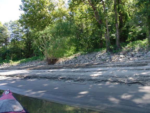 I stopped paddling from one shore to the other days ago. The river is just too wide for that. Now, the only time I cross the river is at the bends when I ride the current. So when I see a likely spot to land and take a break for lunch or just to stretch my legs, I go for it. Sometimes the spot is a gem – firm sandy bottom, shade, no bugs. Other times it’s not so much. Like today.