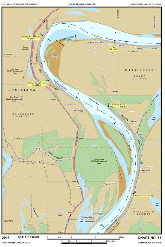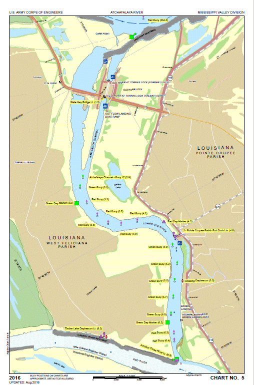 Checking my chart to make sure I hadn’t made a wrong turn, it was a twenty minute paddle before I saw the Lock just beyond the first bend. The Lock was huge! Far larger and far more imposing than those on the Upper Mississippi. And it looked closed for the holiday! I paddled up to the end of the approach wall where I expected to find a bell rope so I could signal the lock attendant that I wanted to lock through. But there wasn’t any! So after scouting around for about thirty minutes looking for a way to announce my arrival, I finally pulled over onto a convenient patch of deep muddy river bank, dug my laptop out of my gear, and opened the digital Atachafalaya Chart folio file. I needed to find what VHF radio channel the lock was monitoring for traffic. That info was in the chart folio.